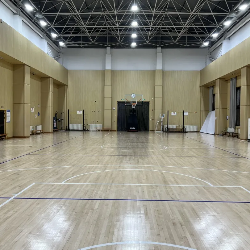 室内篮球与室内排球共用一片场地,按照国家标准比赛场地技术要求及环保要求建设,灯光充足,采用液压篮球架,地面采用木质地板,弹性较好,运动员打球时不易受伤。
