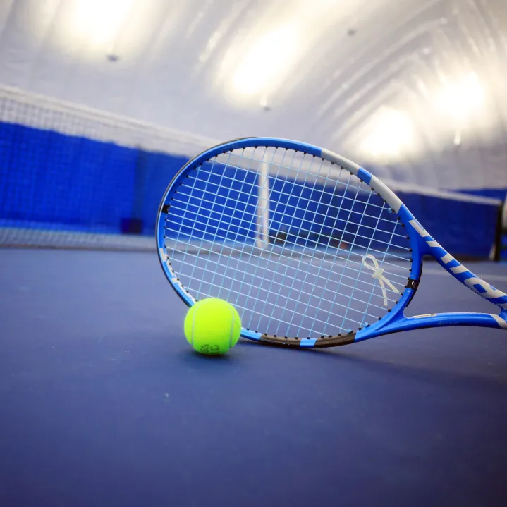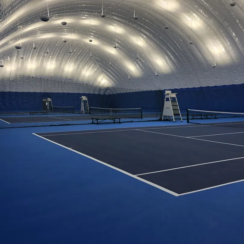 网球场地,按照国家标准比赛场地技术要求及环保要求建设,拥有室外网球场1块及气膜馆室内网球场2块。场地均为塑胶材质,具有平整度好、抗压强度高、硬度弹性适当、物理性能稳定的特性。夜晚有灯光照明,四周采用高围网围住方便捡球,为热爱打网球的小伙伴们提供练习的好场所。