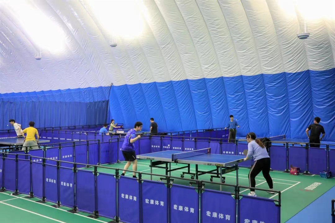 气膜馆共有4片乒乓球场地,采用比赛专业乒乓球台,地面铺设优质专业塑胶,能有效避免、减少运动损伤。