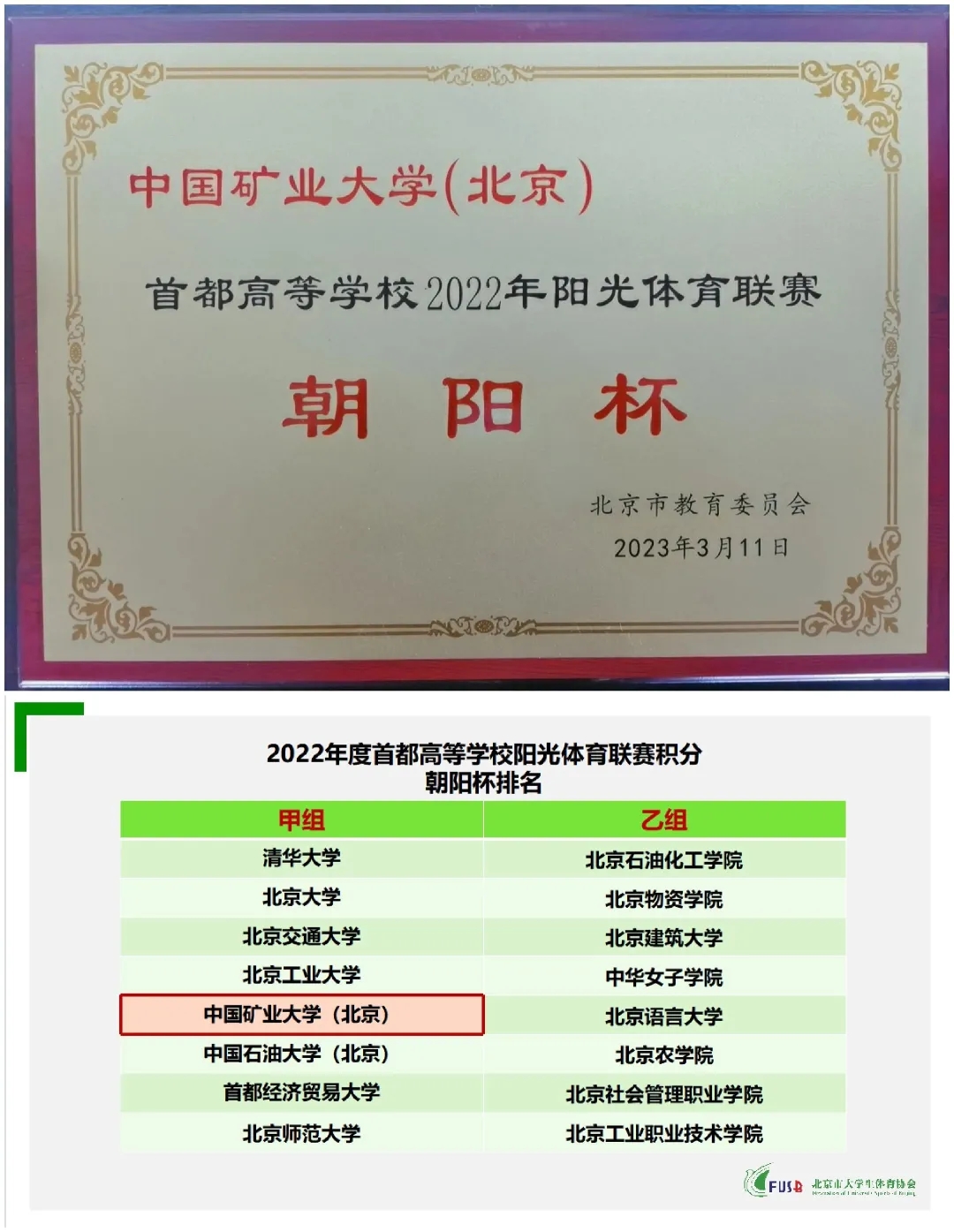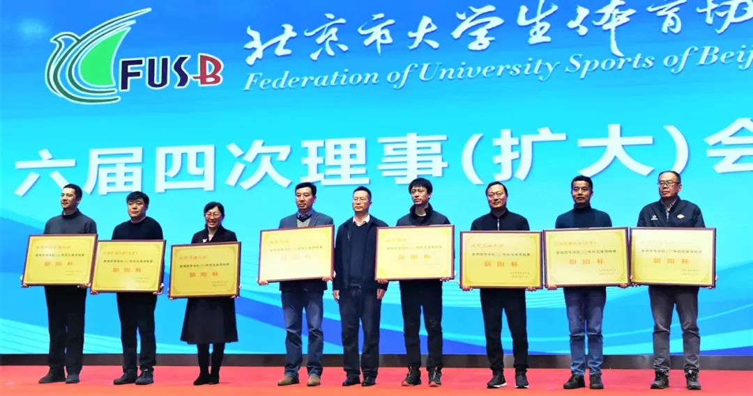 3月11日,北京市大学生体育协会六届四次理事(扩大)会议在北京中影国际会议中心召开。我校获得北京市教委颁发的高等学校2022年度阳光体育联赛“朝阳杯”和“阳光杯”优胜校两项大奖。这是我校首次获得首都高校体育工作最高两项荣誉奖。