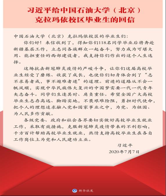 2020年7月8日电 中共中央总书记、国家主席、中央军委主席习近平7月7日给中国石油大学(北京)克拉玛依校区毕业生回信,肯定他们到边疆基层工作的选择,对广大高校毕业生提出殷切期望。