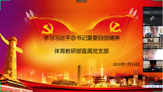 7月14日,体育教研部直属党支部以腾讯会议形式召开全体师生党员大会集中专题学习了习近平总书记重要回信精神。通过学习研讨,全体与会党员认为总书记重要回信内涵深刻、意义重大,要在工作学习中坚决贯彻落实总书记重要指示精神,要以总书记重要回信精神切实加强自身理想信念教育。