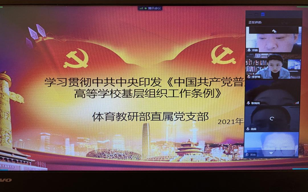 2021年4月25日,体育教研部直属党支部通过腾讯会议集体学习贯彻中共中央印发《中国共产党普通高校学校基层组织工作条例》。体育教研部全体教师和学生党员参加了此次学习活动。会议由支部书记邢鹏主持。