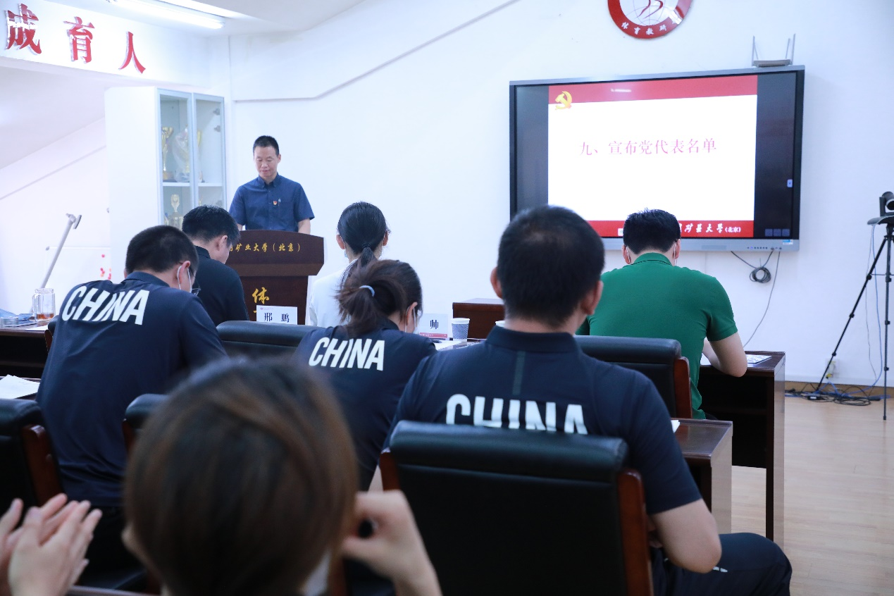 宣读《初次清点到会人数报告单》,宣布可以开会后,大会在庄严的国歌声中拉开帷幕。体育教研部直属党支部书记邢鹏宣读学校党委批复。