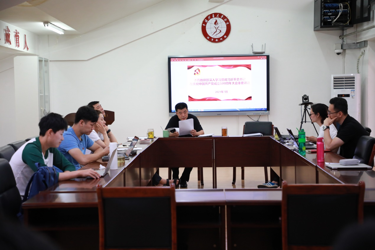庆祝中国共产党成立100周年大会习近平总书记的讲话,字字铿锵,激荡人心,在体育教研部师生中引起强烈反响。体育教研部直属党支部于七一后迅速组织全体党员深入学习领会习近平总书记重要讲话精神,由邢鹏书记带领大家共同学习。