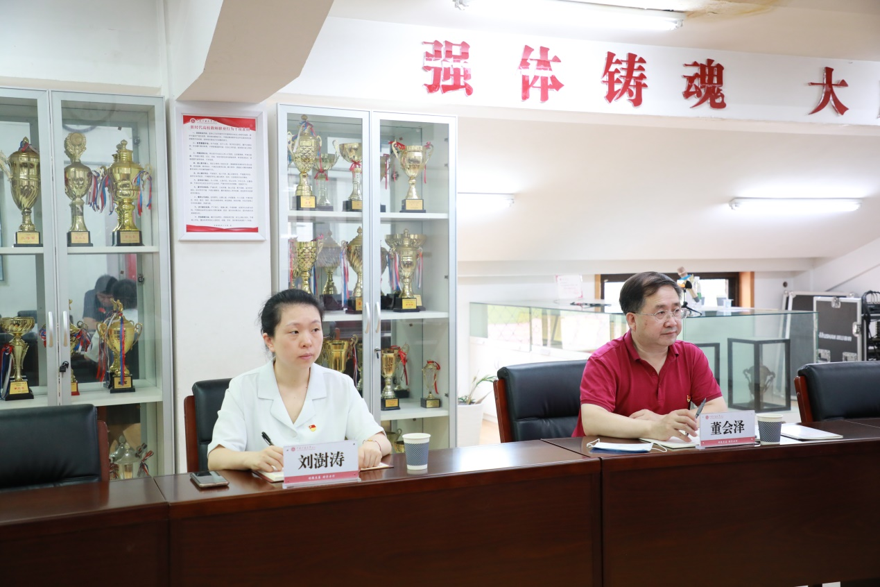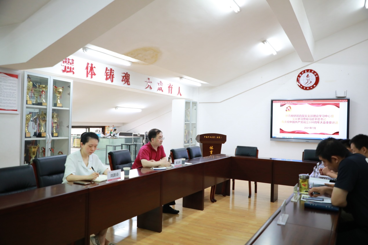 7月14日上午,体育教研部直属党支部理论学习中心组在107会议室组织专题学习研讨,集中学习讨论习近平总书记在庆祝中国共产党成立100周年大会重要讲话精神,校党史学习教育第二巡回指导组副组长、党委宣传部部长董会泽同志;指导组联络员、党委宣传部理论宣传科科长刘澍涛同志到会指导。会议由直属党支部书记邢鹏主持,体育教研部主任杨三军、副主任王耀东、综合办公室主任曾丽君、理论学习中心组成员吴放、高笛参会。