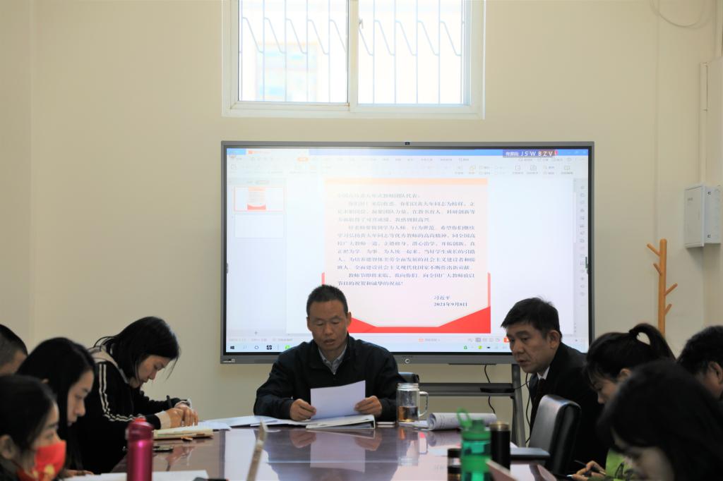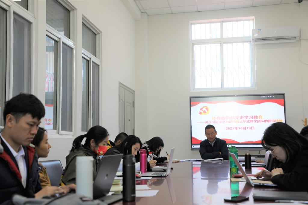 杨三军同志带领大家共同学习了习近平总书记给黄大年式教学团队的回信精神,并对全国高校及我校黄大年式教学团队情况做了简要介绍,鼓励大家要按照总书记的要求,好老师要做到学为人师、行为世范,真正把为学、为事、为人统一起来,当好学生成长的引路人;从提升自身能力,关键着手教学、科研等工作,共同推动体育教研部高质量发展,将坚守教育报国理想、为民族复兴贡献力量的决心深入地融合落实到日常工作之中。