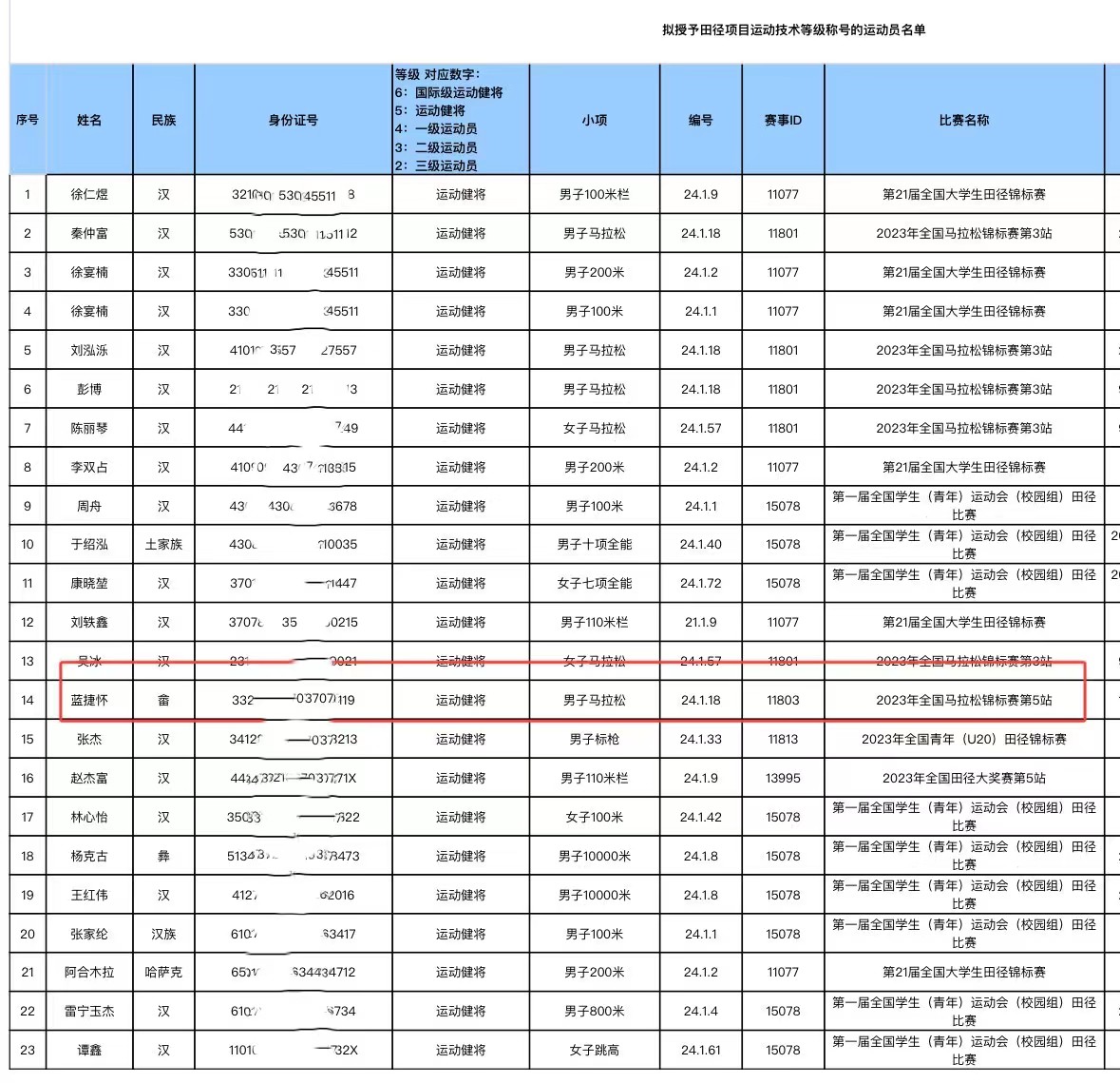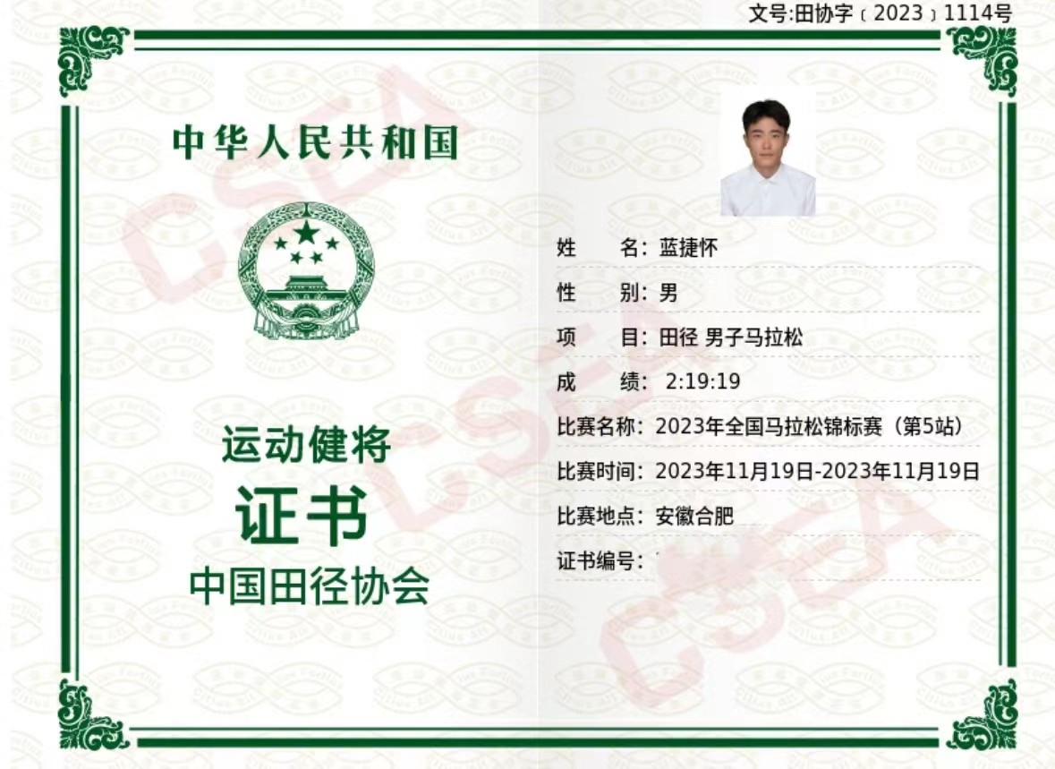 近日,中国田径协会发布《关于授予运动健将称号运动员的通知》,对拟授予田径项目运动健将称号的23名运动员进行公示,我校体育教研部2022级运动训练专业研究生蓝捷怀位列其中,被授予运动健将称号,这是我校体育教研部成立以来,首个由我校自主培养获此称号的学生。此前,蓝捷怀于去年11月参加2023全国马拉松锦标赛(第五站),以2:19:19的个人最好成绩获得男子马拉松第16名。
