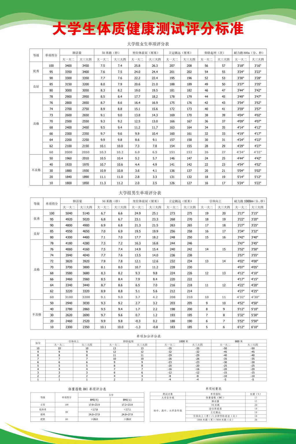 为落实教育部《国家学生体质健康标准(2014年修订)》(以下简称《标准》)和《学生体质健康监测评价办法》(以下简称《办法》)要求,确保在下半学期体测时间及恶劣天气的影响下,及时完成全校学生的体质测试及数据上报工作,结合学校疫情防控要求及实际情况,现就我校2021-2022学年第一学期学生体质健康标准测试工作通知如下:
