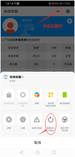 2. 成绩有更新,请点击“重新进入小程序”,成绩重新显示