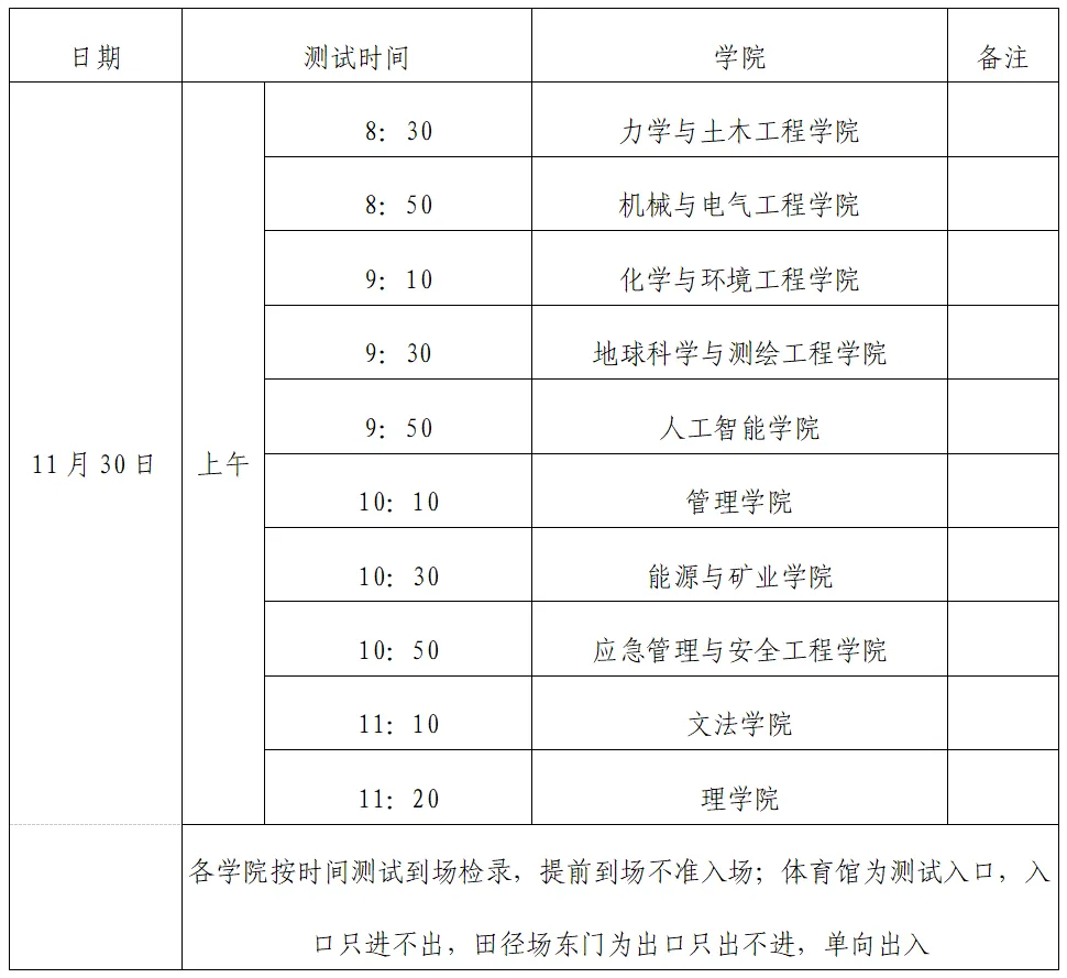 根据学校体测工作安排,将于11月30日(星期六)8:30开始,在学院路校区进行2021级、2022级学生体质测试第二次补测工作。