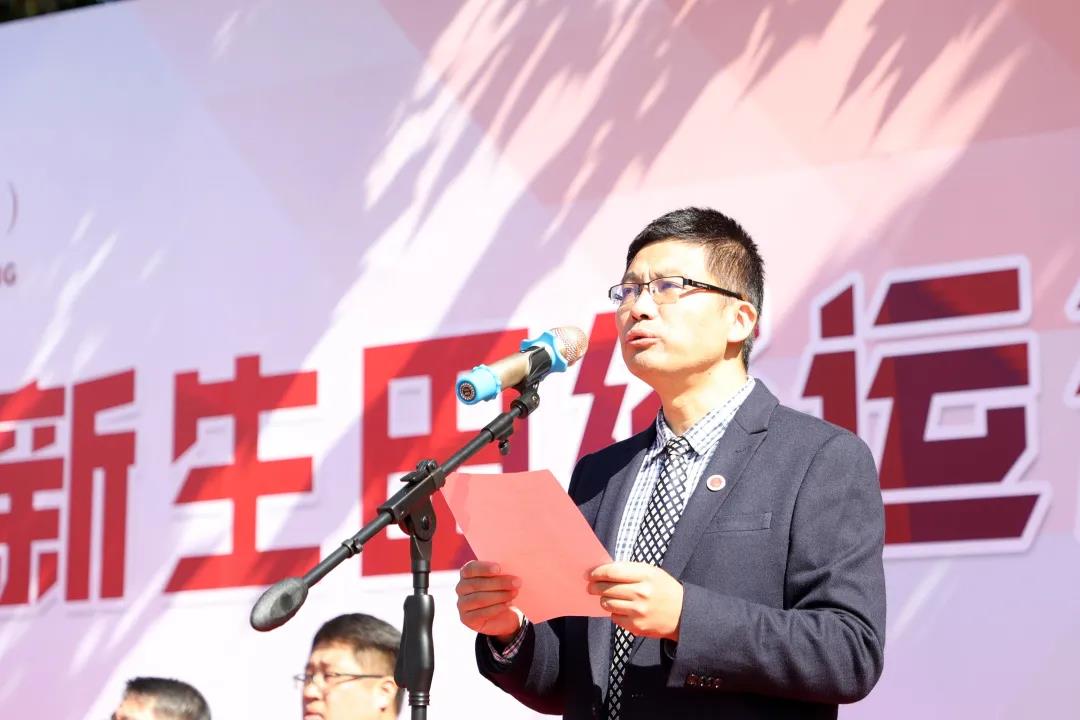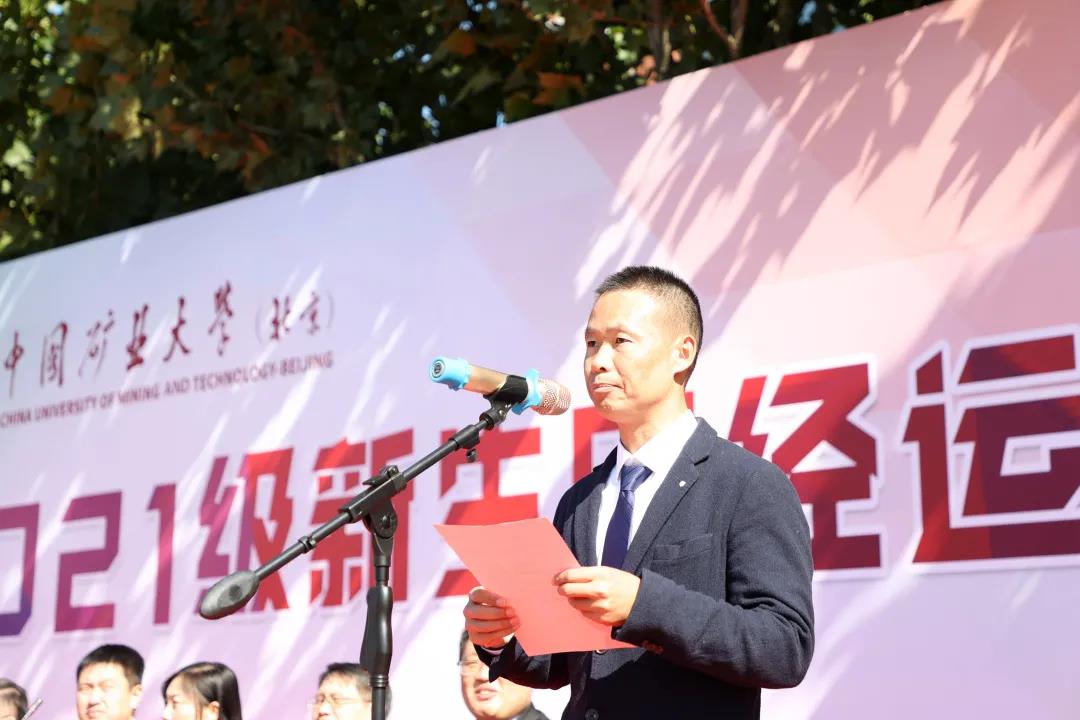 升旗仪式后,副校长王家臣致开幕词。在热烈庆祝中国共产党成立100周年,热烈庆祝中华人民共和国成立72周年之际,在我们满怀豪情迎接北京冬奥会之际,他代表学校党委和行政祝贺新生运动会成功举办,向精心准备、积极参与的师生员工,向全体运动员、裁判员和工作人员表示衷心感谢。国家“十四五”规划和二〇三五年远景目标纲要明确提出到2035年建成“体育强国”,体育已成为中华民族伟大复兴的标志性事业,中国体育强国建设正构筑起新的时代坐标,谱写着逐梦奋进的新篇章。一流的大学应该有一流的体育,一年来,学校积极落实国务院、教育部关于“教会、勤练、常赛”的体育教学改革理念,扎实推进各项体育工作,全面提升学生体质,学校体育领域发展成效显著。举办了首届体育教师体质体能测试赛;沙河校区每月评选校园健康跑之星,2021年预计完成跑步总公里数达73万公里;学校体育运动队在多项比赛中创造历史佳绩。希望全体运动员赛出水平、赛出风采、赛出团结;希望全体裁判员严肃认真,公正裁决;希望全体工作人员恪尽职守、热情服务。希望全校师生弘扬“更高、更快、更强——更团结”的奥林匹克精神,以奋斗者的姿态,抢抓机遇、团结拼搏,为把我校建成世界一流能源科技大学作出新的更大贡献!