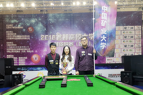 11月18日,2018年首都高校大学生台球锦标赛团体赛在中国传媒大学体育馆落下帷幕。中国矿业大学(北京)台球协会在赵振东老师的带领下参加比赛,队长许昌健与队员邢嘉蹊、张晴晴以精湛的球技和完美的配合,从64支队伍中杀出重围,夺得亚军,刷新了去年团体赛殿军的记录,并荣获精神文明奖。
