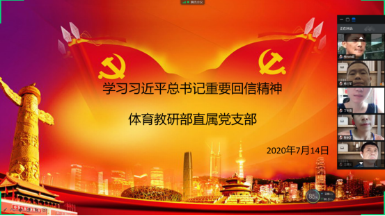 7月14日,体育教研部直属党支部以腾讯会议形式召开全体师生党员大会集中专题学习了习近平总书记重要回信精神。通过学习研讨,全体与会党员认为总书记重要回信内涵深刻、意义重大,要在工作学习中坚决贯彻落实总书记重要指示精神,要以总书记重要回信精神切实加强自身理想信念教育。
