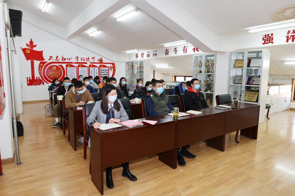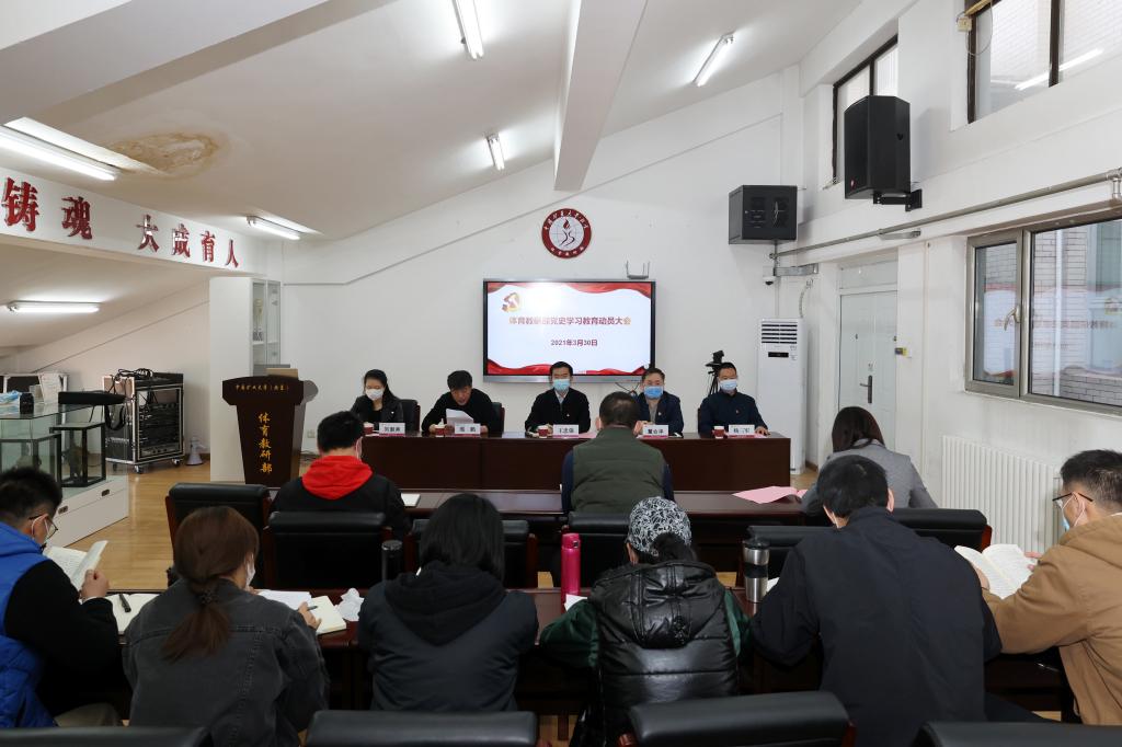 体育教研部直属党支部书记邢鹏传达了学校党史学习教育动员大会精神,并对体育教研部开展党史学习教育做了进一步动员部署:一是要提高政治站位,深刻领会开展党史学习教育的重大意义;二是要盯紧目标任务,扎实有效开展好党史学习教育;三是要围绕中心工作,真正把学习教育成果转化为推动工作的实际成效;四是要强化组织领导,确保党史学习教育高标准高质量推进。