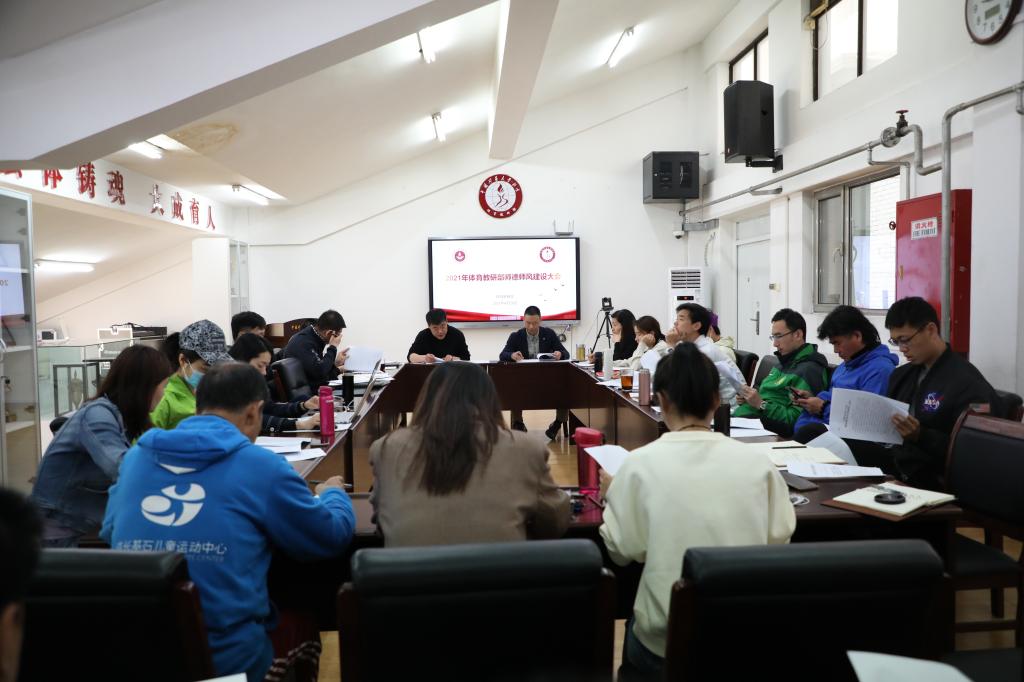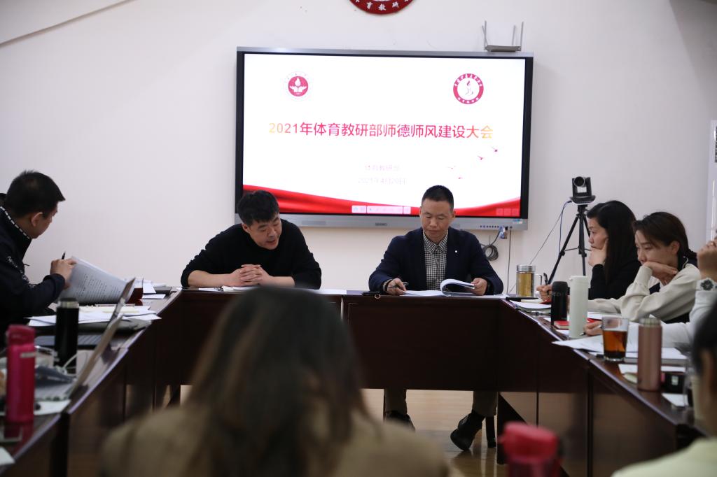 为深入贯彻习近平新时代中国特色社会主义思想,进一步落实全国高校思想政治工作会议精神,认真执行学校关于师德师风专项会议精神,进一步提升体育教研部教师思想政治素养和师德师风水平, 4月20日上午体育教研部师德师风建设大会在107会议室召开。教研部所有在编教师、聘任教师、体育场地管理员工参会,会议由部直属党支部书记邢鹏主持。