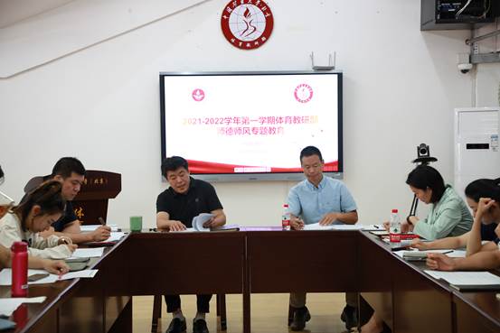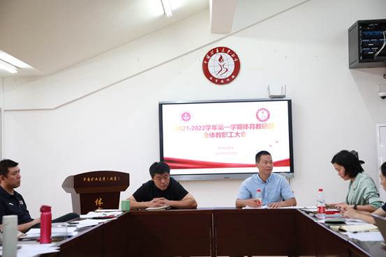 2021年8月27日在107会议室,体育教研部召开了2021-2022学年第一学期第一次全体教职工大会,安排布置本学期教育教学重点工作。教研部全体教职工出席了会议,直属党支部书记邢鹏对违反师德师风案例进行了解读,进一步就新时代教师职业十项准则提出了相关要求;教研部主任杨三军对新学期工作进行了部署,就扎实落实立德树人根本任务,构建高质量课程体系提出了要求,并对新一轮教学、群体、体测、竞训、科研、研究生招生与培养负责人分工进行安排;王耀东就新学期本科教学工作进行了布置;曾丽君就办公室人员工作分工进行了解读;方睿健组织进行了新学期第一周课程安排。此次全体教师会议的召开,为保障新学期教育教学工作的有序开展奠定了基础。