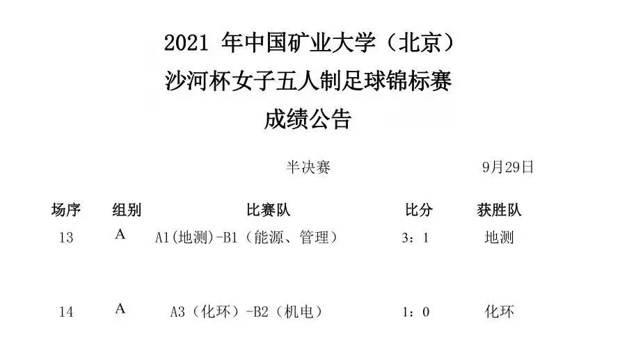 9月29日,半决赛拉开了帷幕。由A组第一地测学院对战B组第二管理能源联队,A组第二化环学院对战B组第一机电学院。最终比赛以地测学院、化环学院获胜结束。