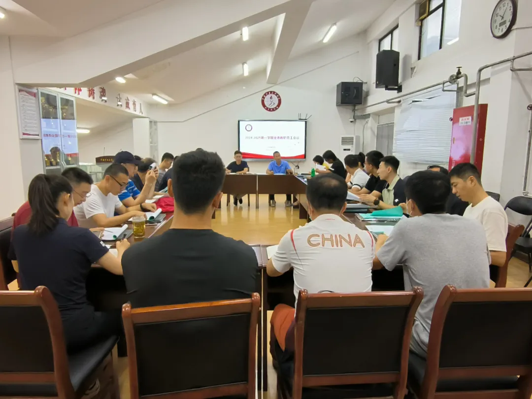 本网讯 2024年8月30日上午,体育教研部在107会议室召开了2024-2025学年第一学期第一次全体教职工大会,安排布置本学期教育教学重点工作,教研部全体教职员工出席了会议。体育教研部主任杨三军主持会议。