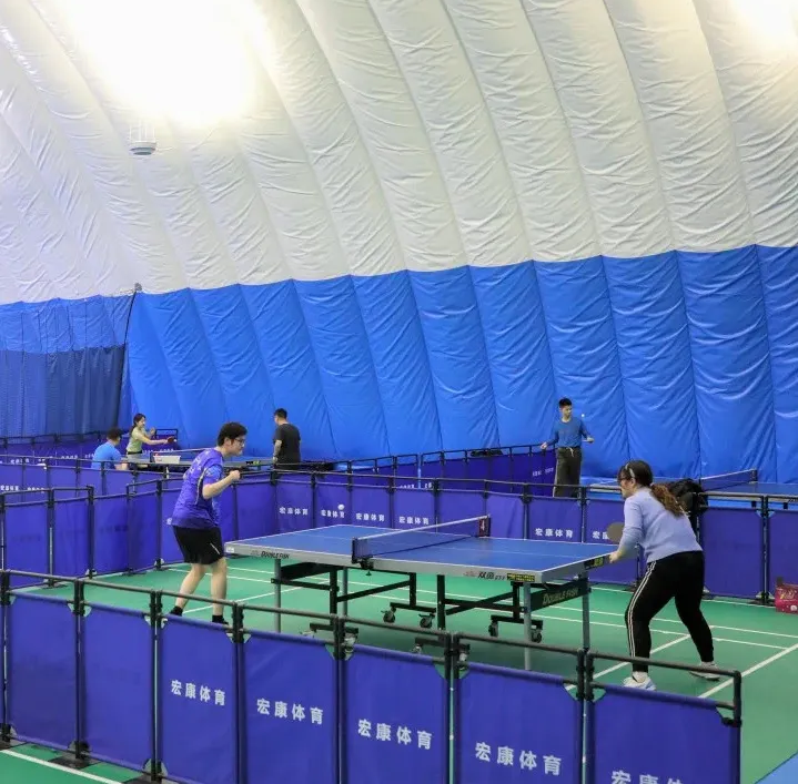 气膜馆共有4片乒乓球场地,采用比赛专业乒乓球台,地面铺设优质专业塑胶,能有效避免、减少运动损伤。