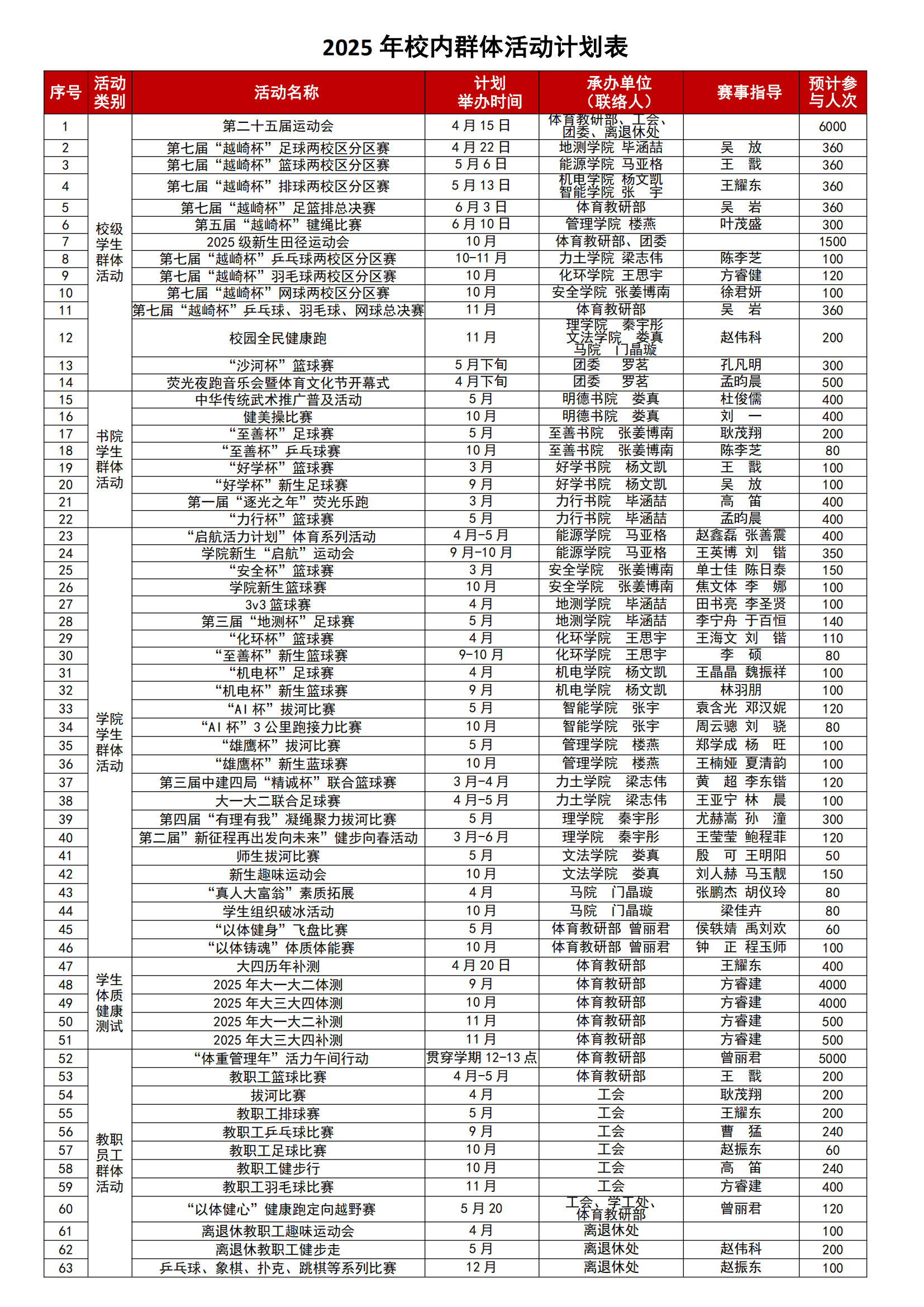 学校第二十五届运动会将于4月15日在学院路校区田径场举行。本届运动会共设置各类师生田径赛、趣味赛、学生体质健康达标赛、离退休教职工趣味赛等各类项目23项。