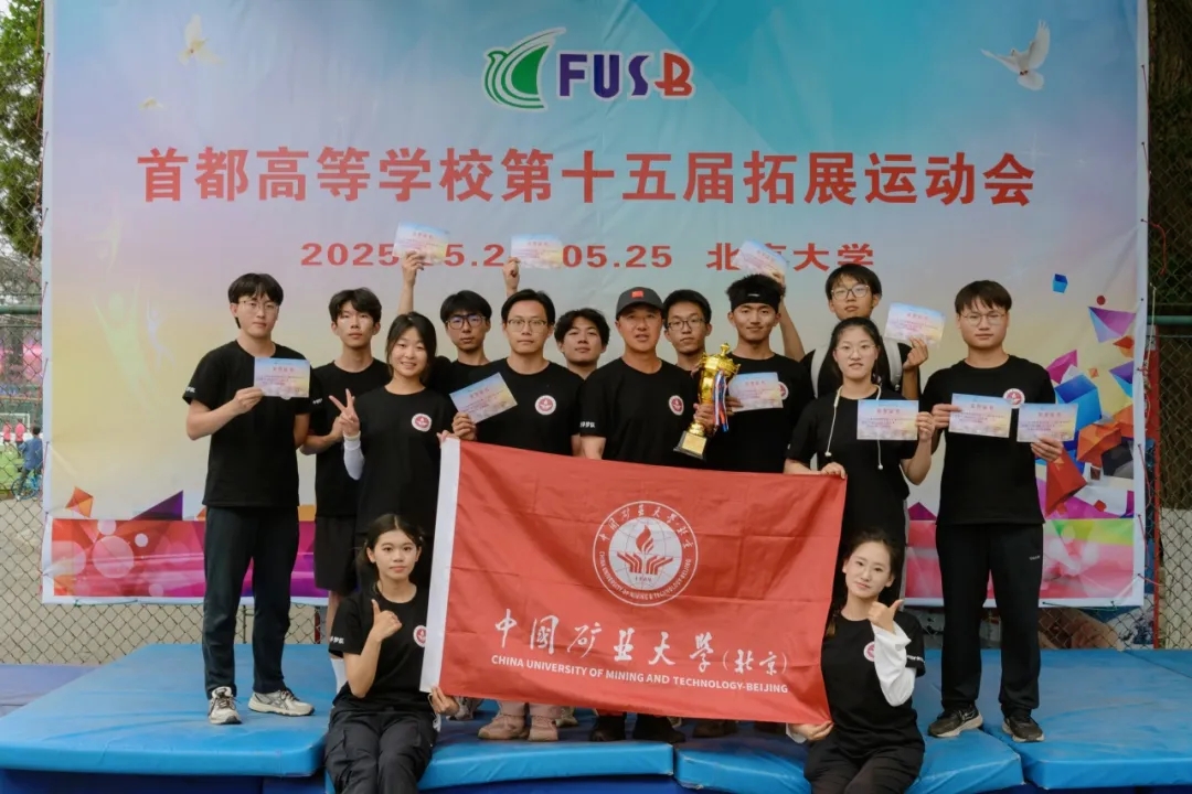 5月24-25日,备受瞩目的首都高等学校第十五届拓展运动会在北京大学举行。中国矿业大学(北京)矿野寻梦队在校体育部以及领导的支持下,在指导教师赵魁的指导下,从一众高校当中脱颖而出,斩获多项比赛第一,并荣获甲组团体总分第二(本届运动会分为单人、双人和团队项目,最终排名由各项目积分总和决定)。