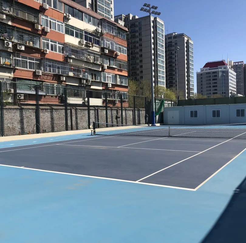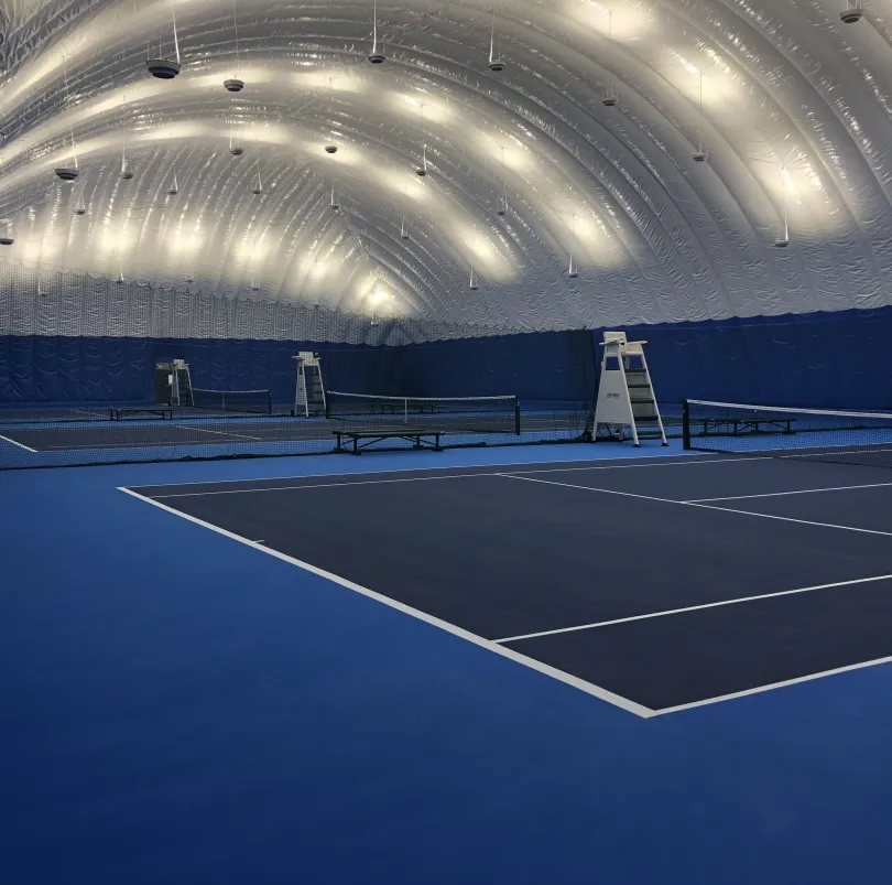 网球场地,按照国家标准比赛场地技术要求及环保要求建设,拥有室外网球场1块及气膜馆室内网球场2块。场地均为塑胶材质,具有平整度好、抗压强度高、硬度弹性适当、物理性能稳定的特性。夜晚有灯光照明,四周采用高围网围住方便捡球,为热爱打网球的小伙伴们提供练习的好场所。