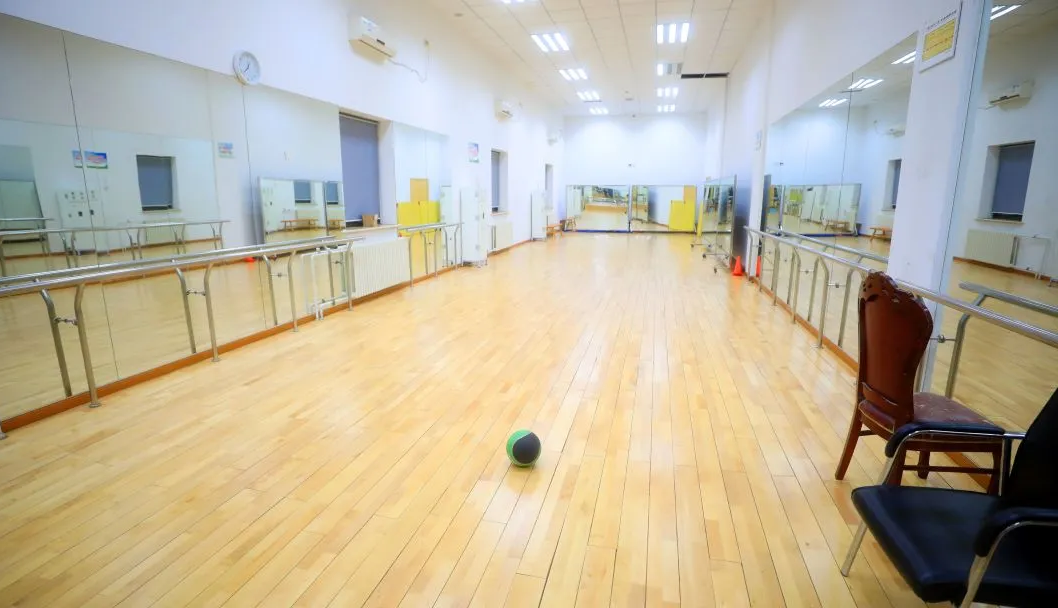 体育训练馆舞蹈室室内设备齐全,环境优雅,配有木地板、空调、音响系统、全身镜、弹性地板、舞蹈排练杠。